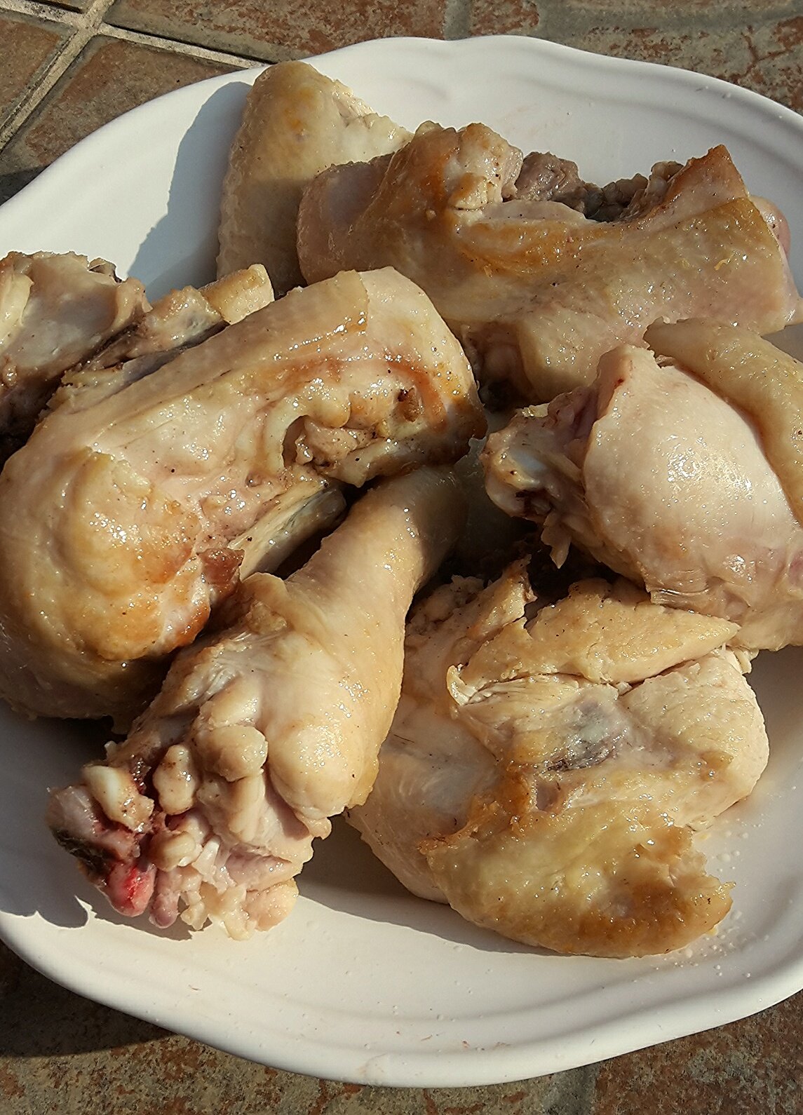 A csirkét alkatrészeire bontottam, besóztam. Vajat egy kis zsírral felhevítettem és a csirkedarabokat erős tűzön elősütöttem.