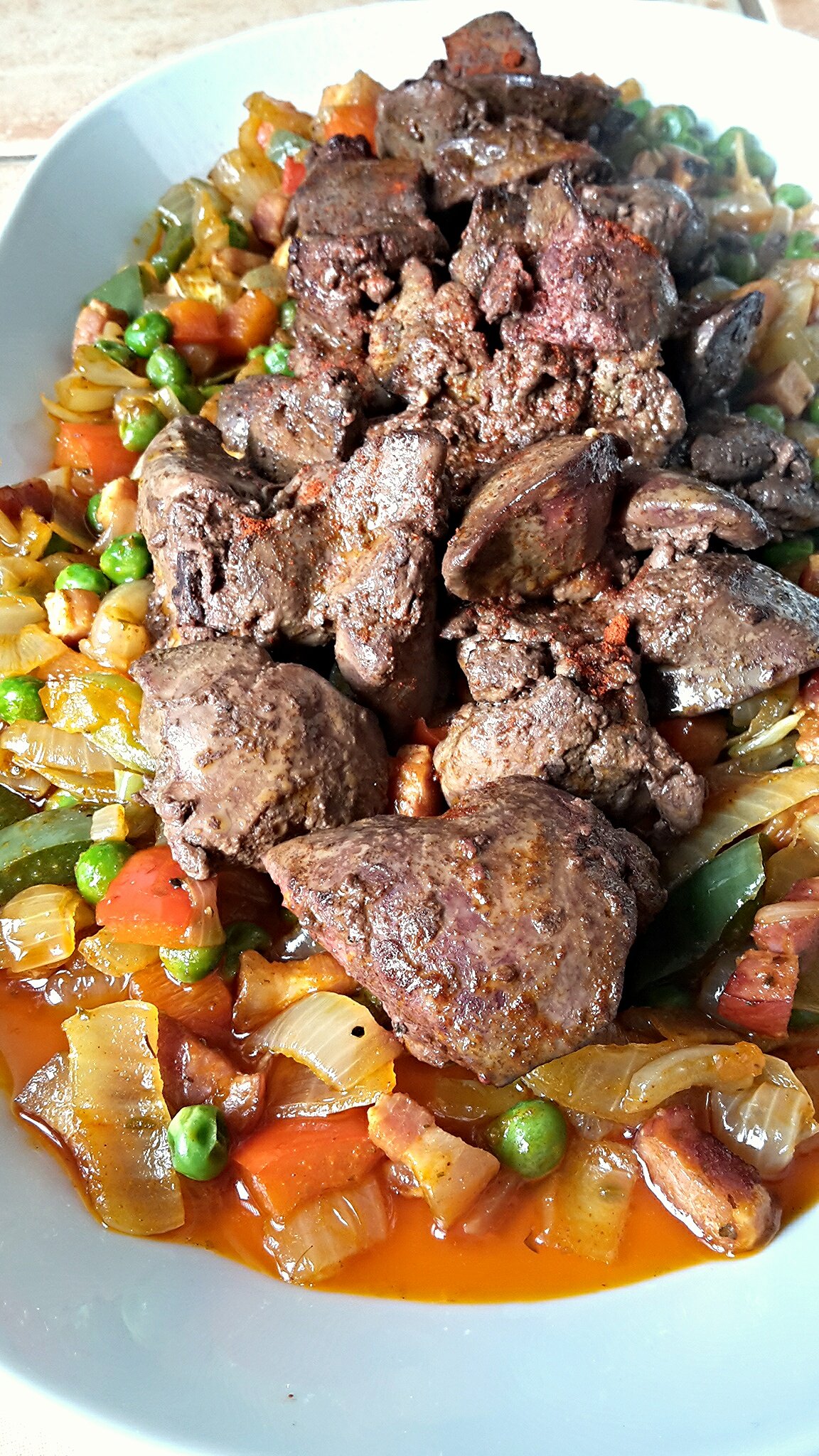 Egy tálaló edénybe kiszedtem a ragut, ráhalmoztam a kisült májakat és tálalásig a meleg sütőben várta, míg a krumplipürét elkészítettem.