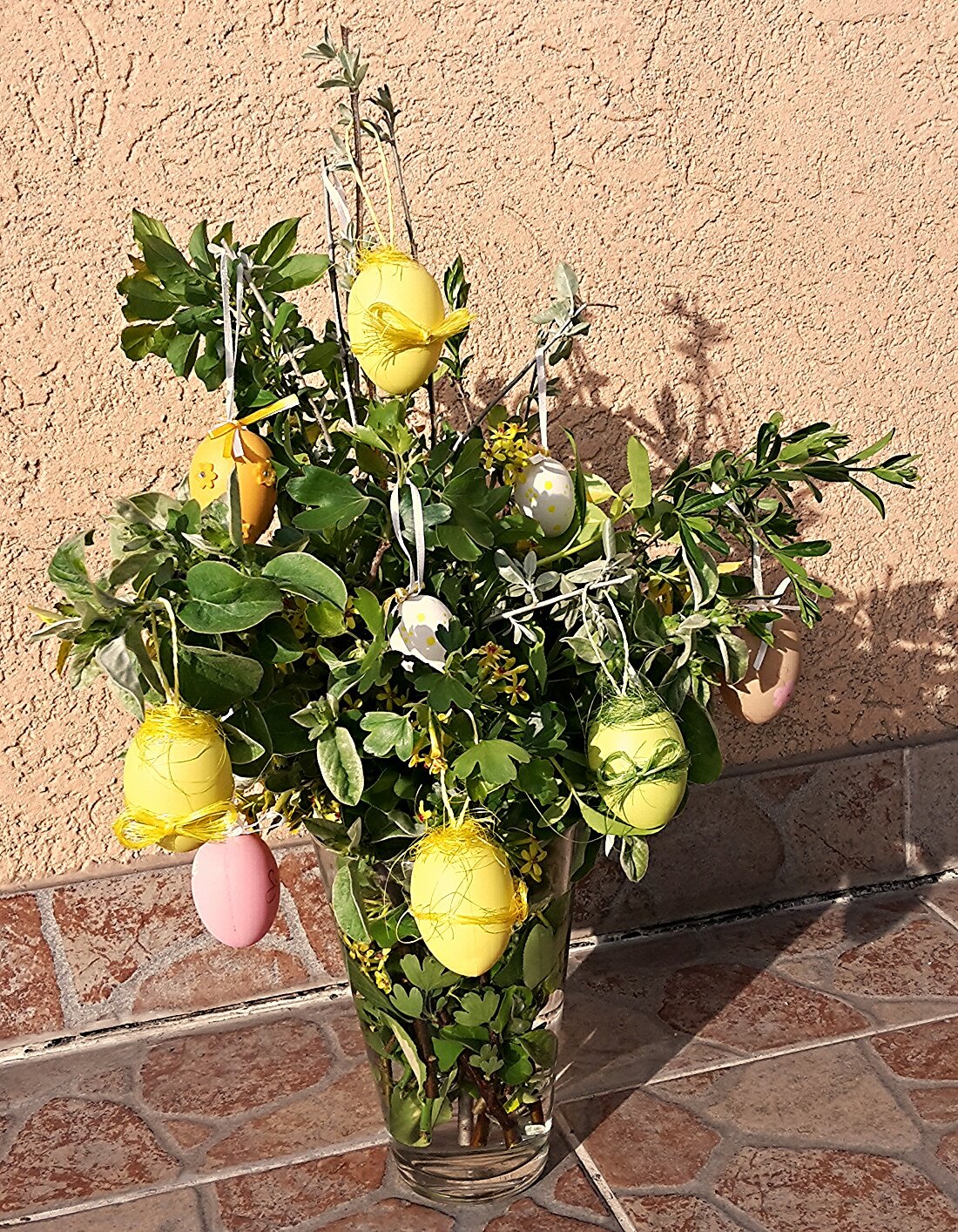 A kertünk bokraiból, fáiból vágott ágakra akasztgatott színes tojások.