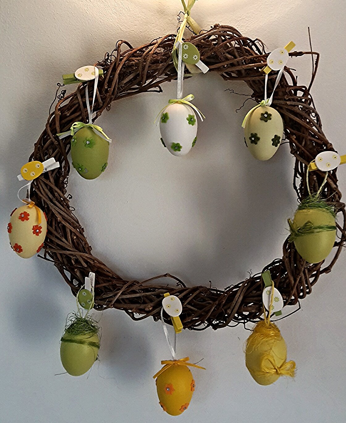A karácsonyi, szőlővesszőből készült koszorúra is kerültek a tojásokból, ami az étkezőnket díszíti.